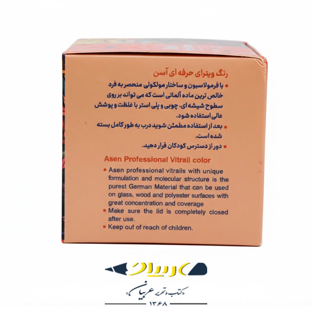 رنگ ویترای حرفهای آسن (Asen) محصولی از گروه هنری آسن (Asen Art Group) است که با بهرهگیری از فرمولاسیون و ساختار مولکولی منحصربهفرد تولید شده است. این محصول با استفاده از خالصترین مواد اولیه آلمانی تهیه شده و به دلیل پایه حلال (Solvent Based) بودن، پس از خشک شدن کاملاً شفاف، درخشان و مقاوم در برابر شستشو است. غلظت بالا و پوششدهی عالی این رنگها اجازه میدهد تا هنرمند نهتنها بر روی شیشه، بلکه بر روی سطوح چوبی و پلیاستر نیز آثاری با رنگهای زنده و عمیق خلق کند.
