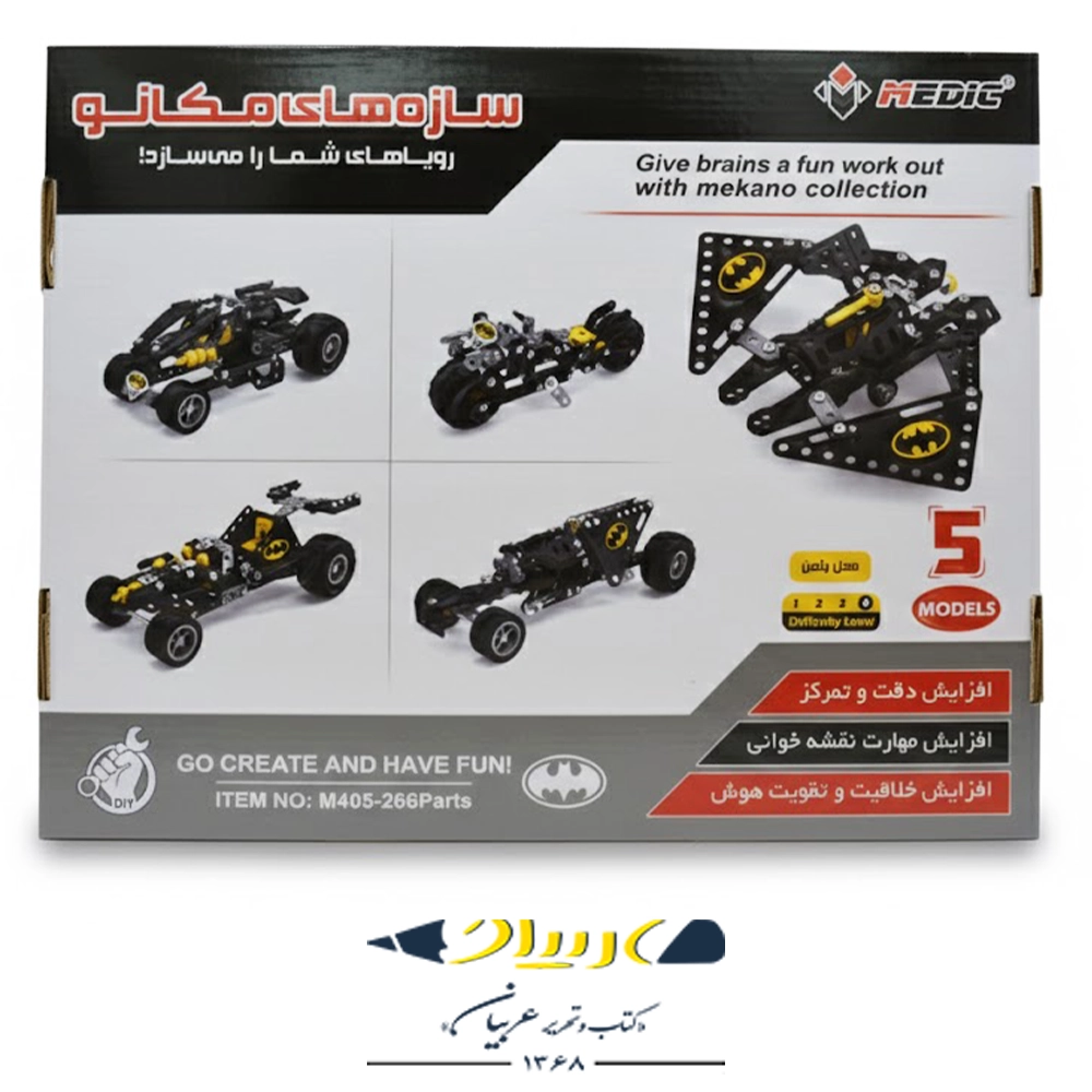 مجموعه «سازه فلزی مدل بتمن» از سری مکانو (Mekano) برند مدیک، یک پکیج مهندسی جذاب است. این کیت با ۲۶۶ قطعه فلزی و پلاستیکی، به کودکان اجازه میدهد تا مدلهای مختلفی از وسایل نقلیه بتمن را با ابزار واقعی (آچار و پیچگوشتی) بسازند. این بازی تلفیقی از هیجان دنیای ابرقهرمانی و آموزش مبانی مکانیک است.