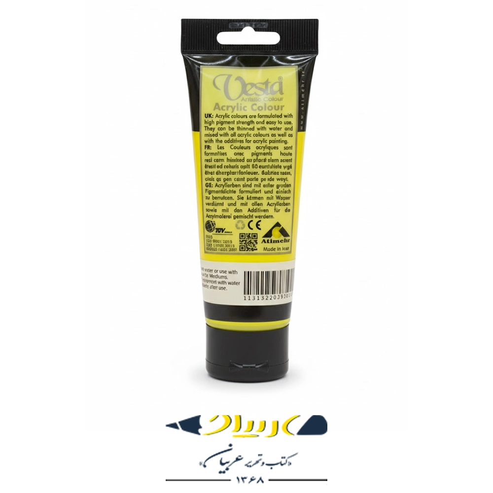رنگ اکرولیک وستا (Vesta) کد ۱۱۰ با نام اختصاصی Fluorescent Yellow (زرد فسفری/فلورسنت)، یکی از درخشانترین طیفهای نوری در مجموعه رنگهای وستا است. این محصول با کیفیت هنری عالی (Fine Artist Quality) تولید شده و به دلیل خاصیت فلورسنت، در نور روز درخشش فوقالعادهای دارد و تحت تابش نور UV (بلکلایت) به شدت بازتاب پیدا میکند. این رنگ برای ایجاد جلوههای مدرن و جلب توجه حداکثری در آثار هنری انتخابی ایدهآل است.